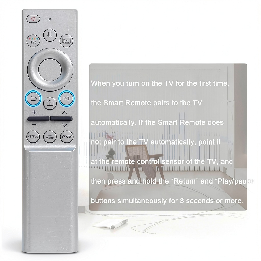 To pair the remote, press and hold both the return and pause buttons simultaneously for approximately 3-5 seconds. The remote will automatically sync with your compatible Samsung TV. No additional software or complicated setup is required for the pairing process.
