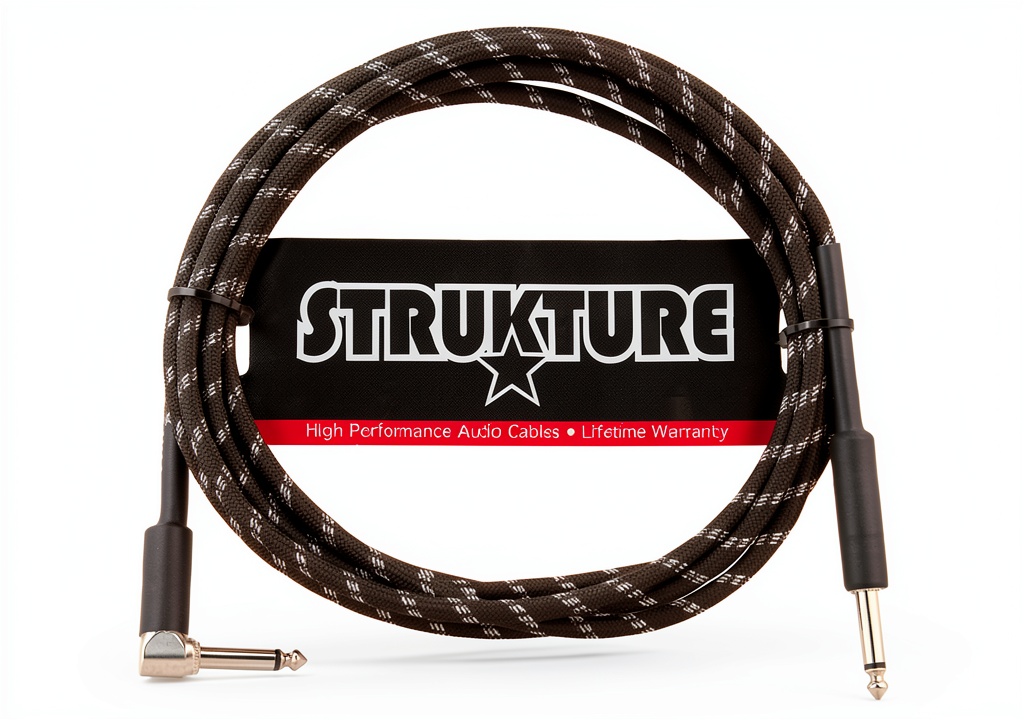 The STRUKTURE Instrument Cable in Vintage Black/Silver is a 10-foot cable designed for musicians and audio professionals. It features a 1/4-inch right-angle plug on one end and a straight nickel-plated plug on the other, ensuring secure connections and stable signal transmission. Constructed with a high-quality woven outer covering and reinforced by a shrink-wrap sleeve, it resists separation at termination points for enhanced durability. The cable includes thick ABS inner sleeves that protect solder connections, supporting long-term performance in various settings. Its spiral shielding minimizes electromagnetic and radio frequency interference, delivering consistent clarity and reducing unwanted noise.